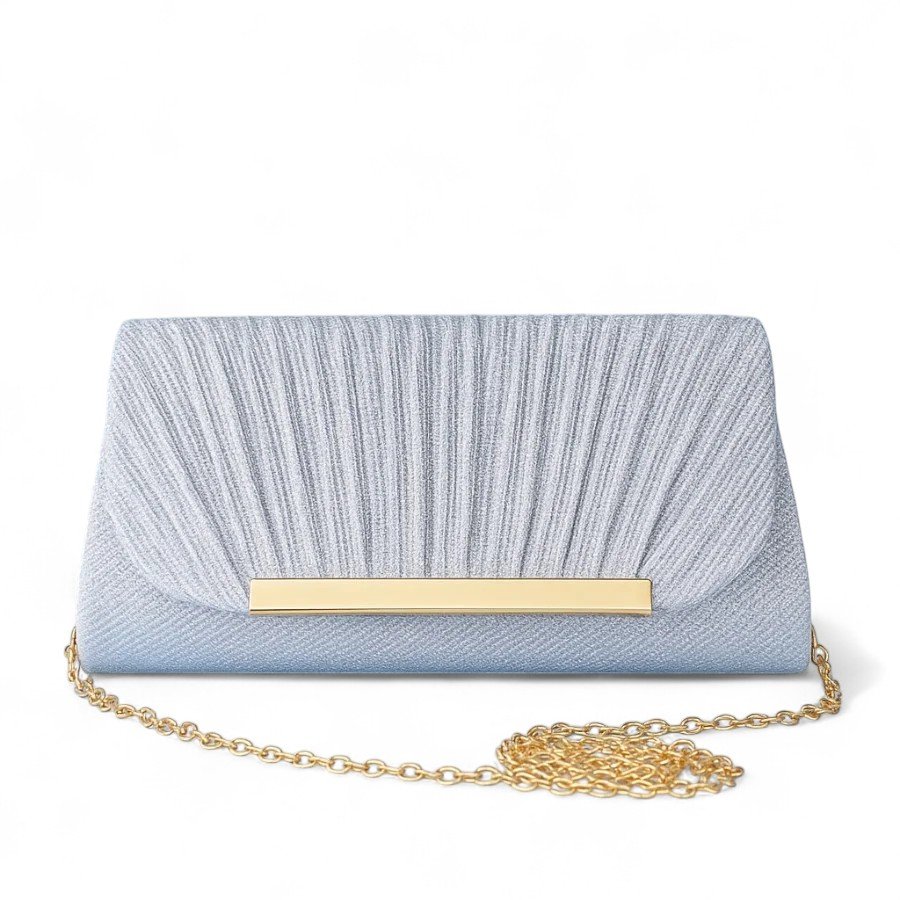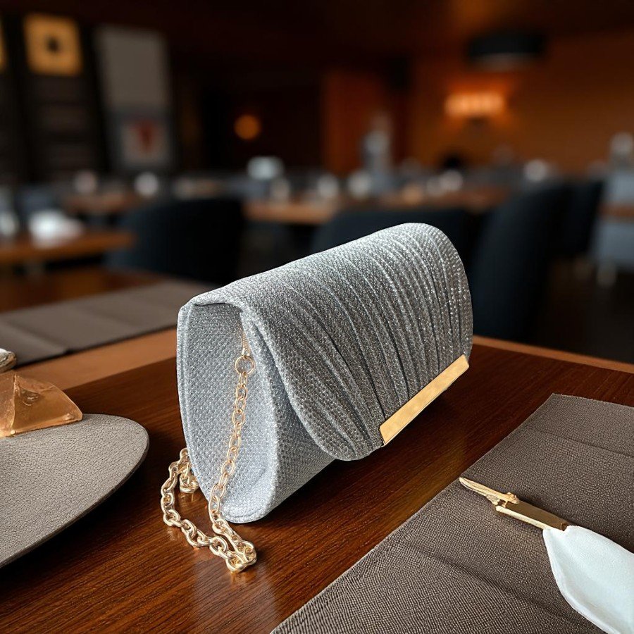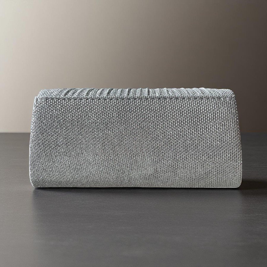 💫 Eleva tu look de fiesta con este bolso de noche plateado de diseño elegante y textura brillante.