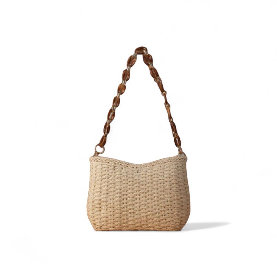 Bolso cruzado de verano en color beige claro con diseño trenzado y asa de eslabones efecto carey, ideal para tus días de playa o escapadas con estilo.