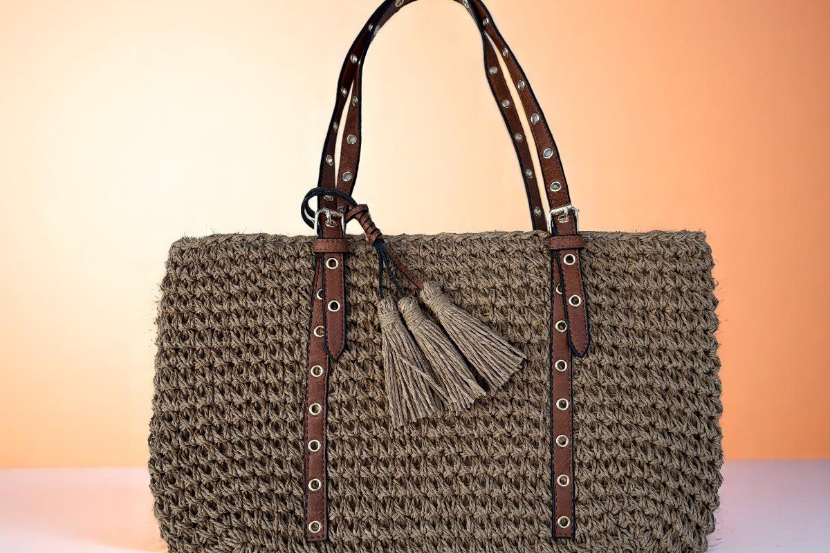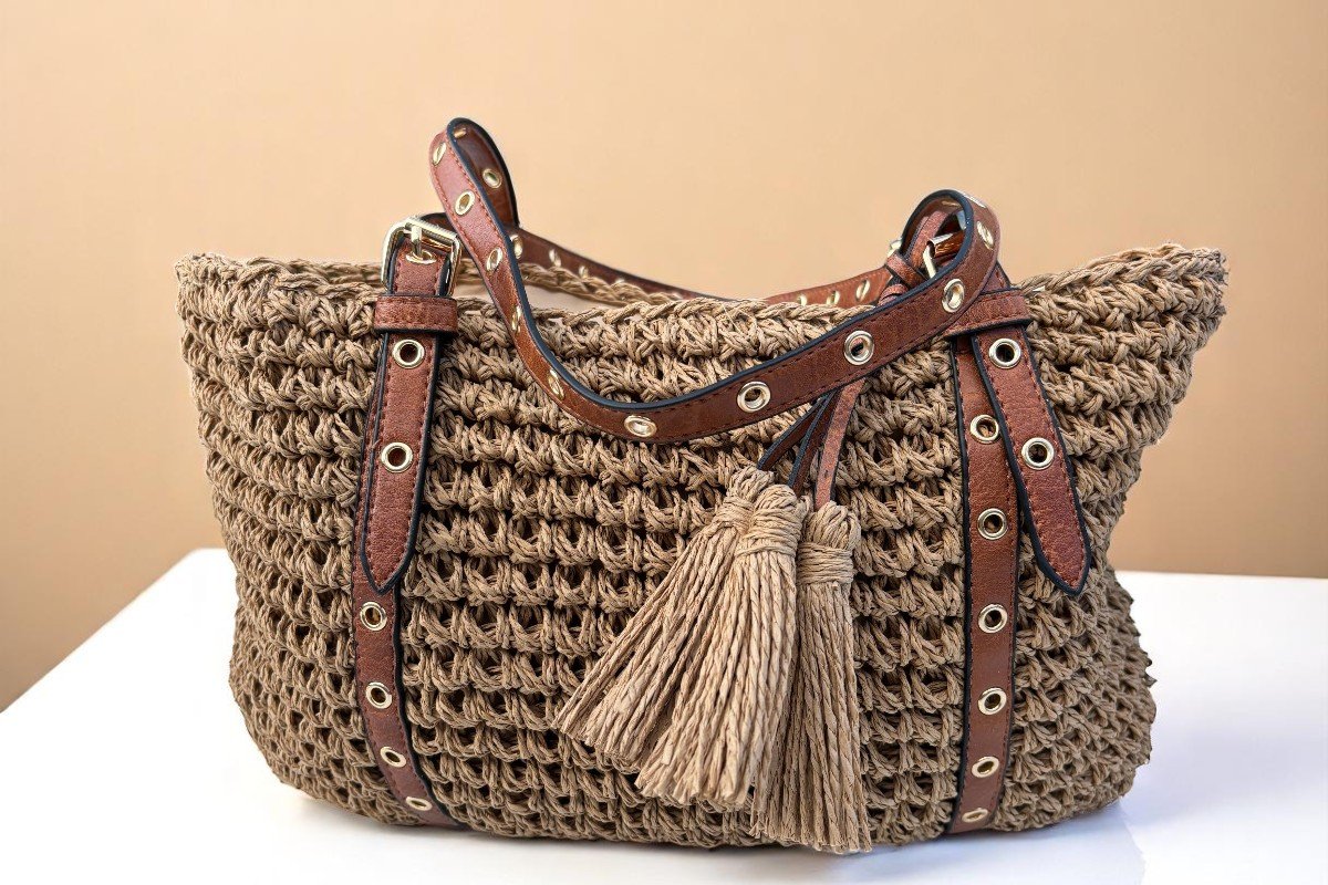 Dale un toque boho-chic a tu día a día con este bolso shopper en color natural, pensado para chicas que adoran los looks relajados pero con estilo. Su diseño trenzado artesanal y los detalles en polipiel marrón con tachuelas lo convierten en tu nuevo bolso favorito para verano, escapadas y paseos con amigas.