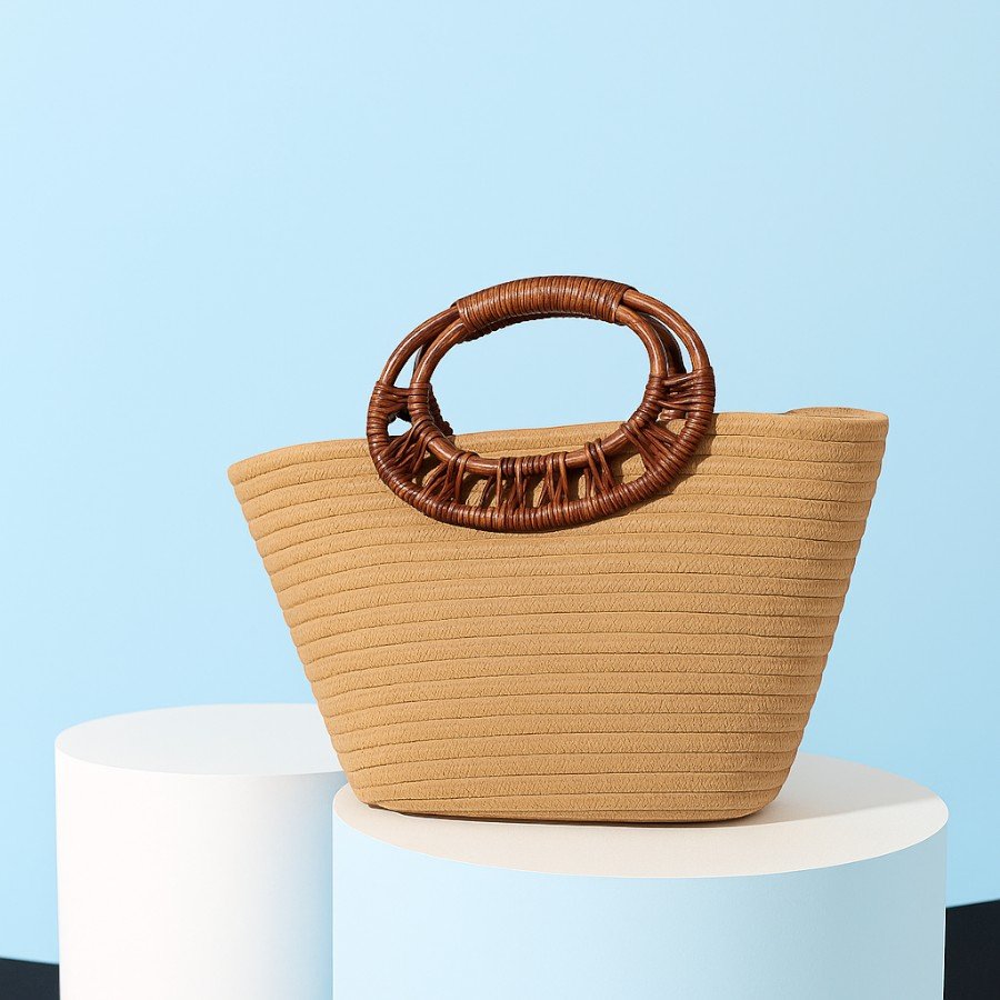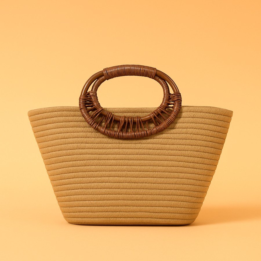 Bolso de mano camel con diseño tejido a mano y asas circulares de efecto madera. Ideal para tus looks diarios con un toque boho y natural.